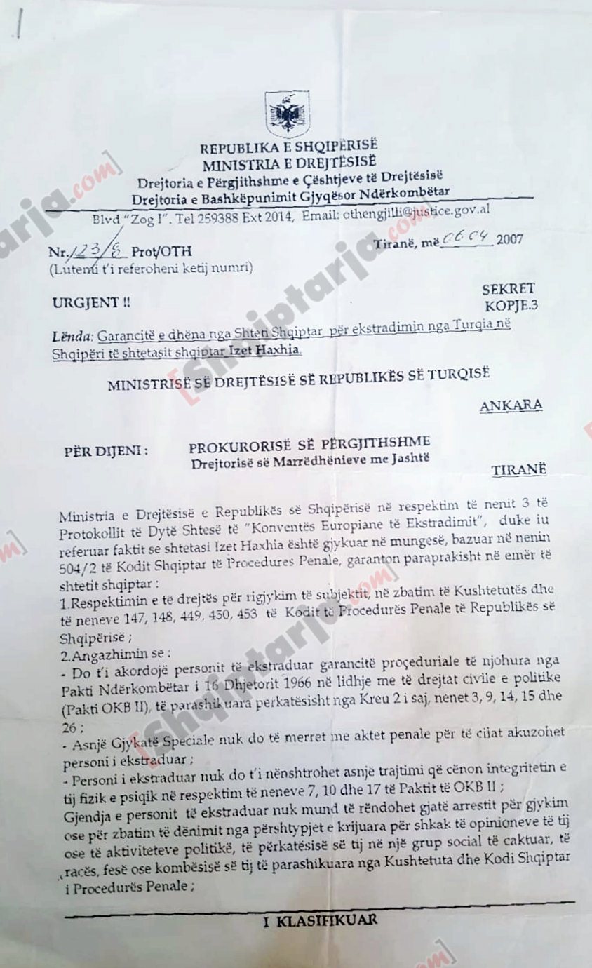Dokumenti i drejtohet Ministrisë së Drejtësisë së Republikës Turke, përmes të cilit ministri i atëhershëm në detyrë Rusmaili thotë se: “në bazë të Konventës Europiane të Ekstradimit, duke iu referuar faktit se shtetasi Izet Haxhia është gjykuar në mungesë në bazë të nenit 504/2 të Kodit Shqiptarë të Procedurës Penale, garanton paraprakisht në emër të shtetit shqiptarë, respektimin e të drejtës së rigjykimit, në zbatim të së drejtës kushtetuese”.
