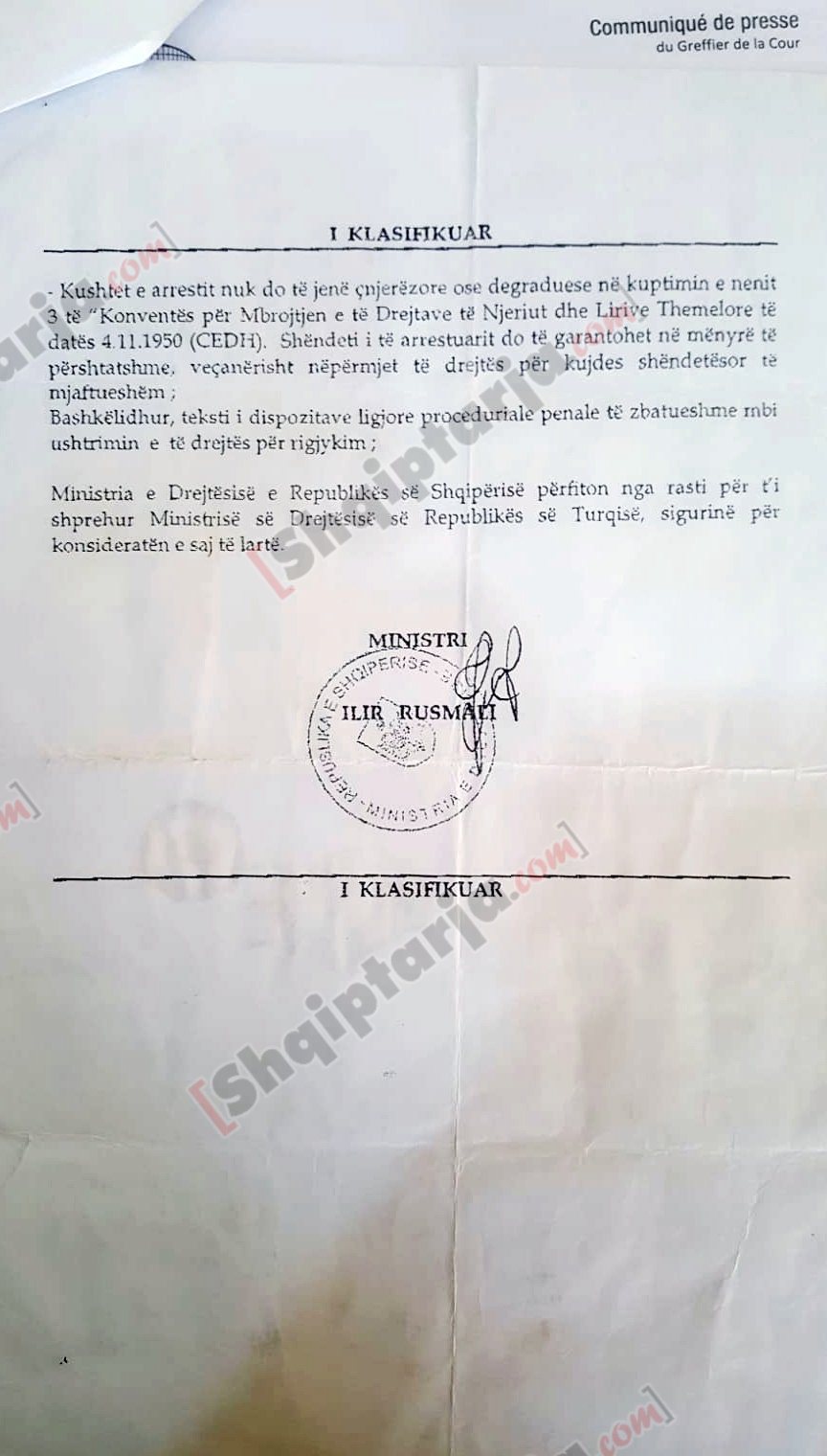 Bëhet fjalë për këtë dokument me mbishkrimin sekret hartuar nga Ministria e Drejtësisë datë 06.04.2007 dhe mban firmën e ish ministrit të drejtësisë Ilir Rusmali.