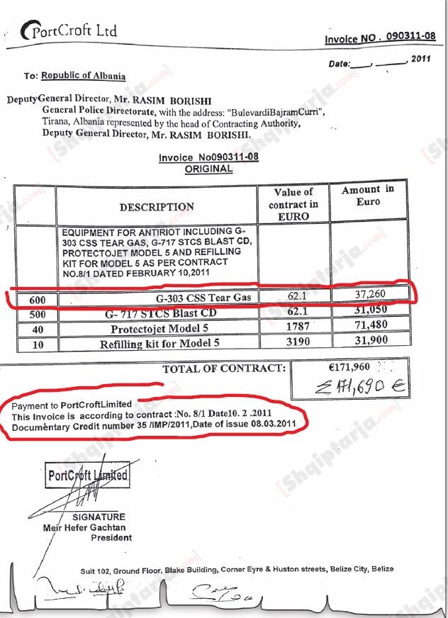 “Gazi helmues” i llojit “CSS”, i përdorur nga Policia në javët e fundit gjatë trazirave me protestuesit e opozitës tek selia e Qeverisë dhe ajo e Kuvendit dhe për të cilin dje Partia Demokratike ka bërë kallzim penal kundër ministrit të Brendshëm Sandër Lleshaj dhe disa drejtuesve të Policisë, në të vërtetë është blerë për Policinë shqiptare pikërisht nga Lulzim Basha, kur ai ka qenë ministër i Brendshëm. Prova për këtë është në një dokument ekskluziv, të cilin e ka siguruar dhe po e publikon Redaksia Investigative e Shqiptarja.com. Fjala është për faturën e pagesës së bërë shoqërisë ”PortCroft Ltd” me seli në Belize, një parajsë fiskale e Amerikës Qendrore, më 8 mars 2011, me të cilën janë blerë nga Policia e Bashës 600 granata me gaz lotësjellës model “G-303- CSS”, të njejtat që janë përdorur ditët e fundit në Tiranë. Granatat e gazit lotësjellës “CSS” janë paguar me 62.1 euro secila për një total 37.260 euro.