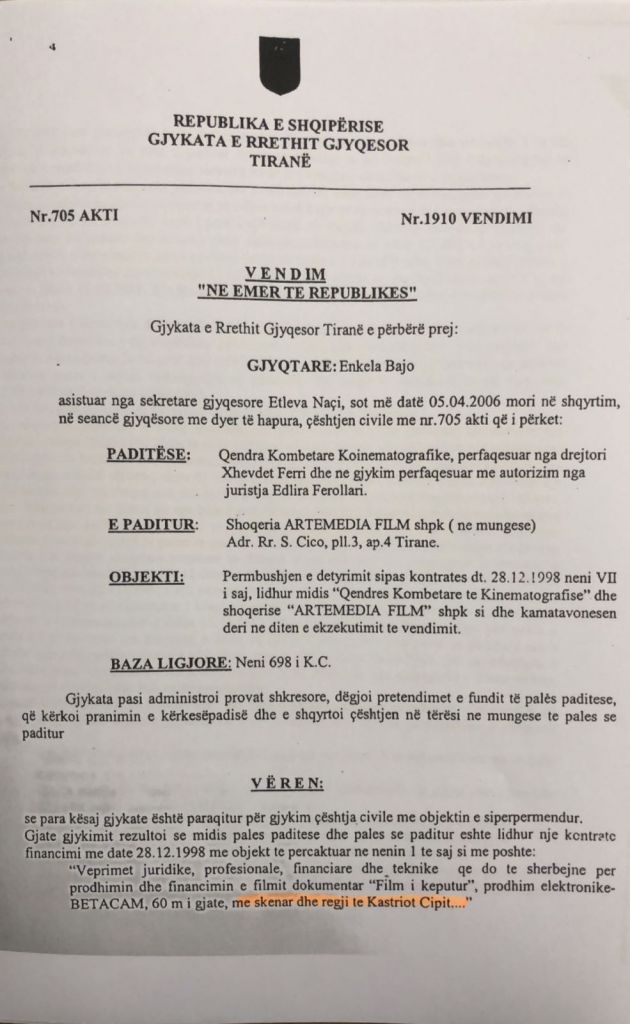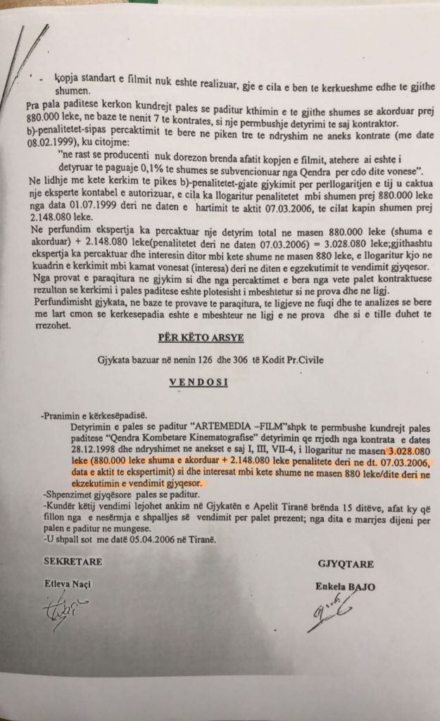 E ndodhur në këto kushte, kur nga Çipi dhe Budina nuk janë përmbushur detyrimet e tyre kontraktore, QKK-ja i është drejtuar sërish gjykatës duke kërkuar kthimin e shumës së akorduar, kamatvonesave dhe penaliteteve të tjera. Nga provat e paraqitura në gjykim, gjykata e ka gjetur të drejtë kërkesën e QKK-së, ndaj ka vendosur pranimin e kërkesëpadisë dhe detyrimin e palës së paditur, “ARTEMEDIA-FILM” shpk, me drejtues Çipin dhe Budinën, të përmbushë kundrejt palës paditëse “Qendra Kombëtare e Kinematografisë”, detyrimin që rrjedh nga kontrata, i llogaritur në masën 30 milion lekë (8.8 milion lekë shuma e akorduar + 21.2 milion lekë penalitet).
