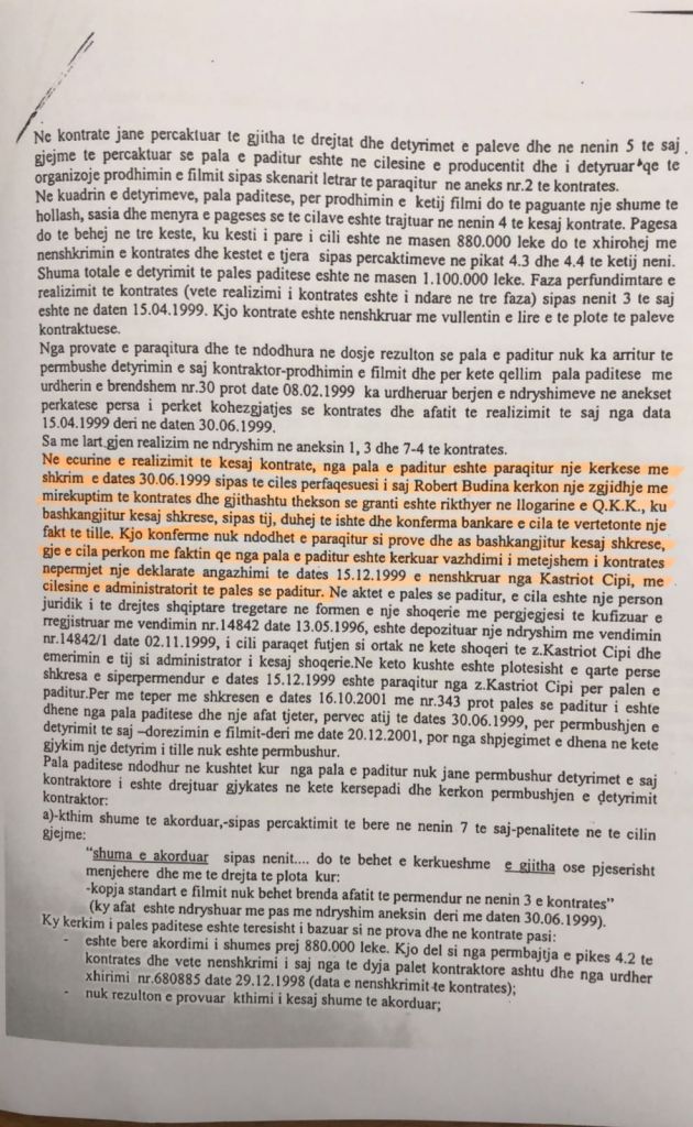 Sipas vendimit të formës së prerë të Gjykatës së Tiranës (gazeta zotëron një kopje), Çipi dhe Budina kanë përfituar një fond nga QKK-ja për realizimin e filmit dokumentar me titull “Film i këputur”.