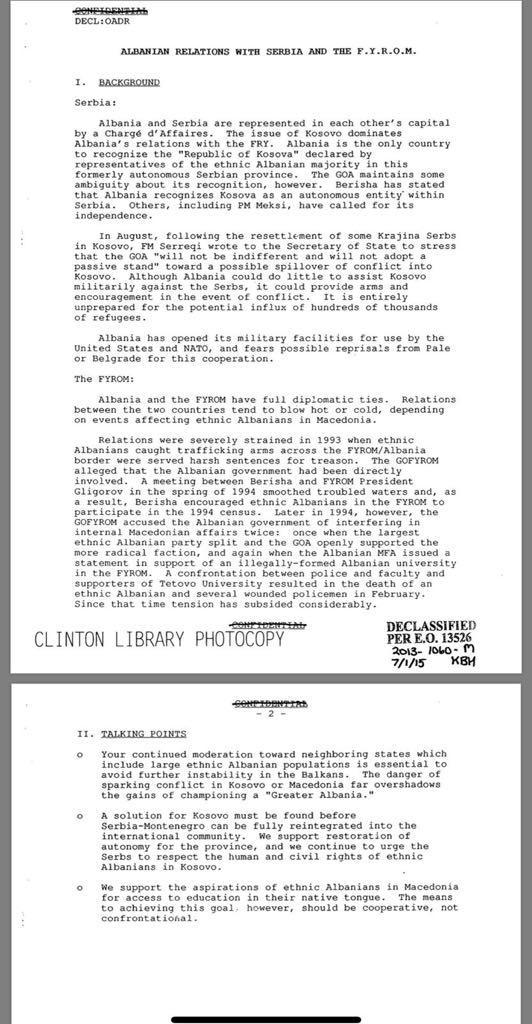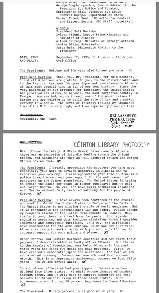Rrjedhimisht, ky nuk eshte deformim i te vertetes e as gjykim per pozicionin e Sali Berishes ne raport me qeshtjen e Kosoves. Une e kuptoj kontekstin dhe e kam te qarte pozicionin e tij ne kete situate. Por, kjo shperndarje e ketij memorandumi te deklasifikuar te Presidences Clinton sherben si shpjegim i thjeshte se historia nuk mund te ri-shkruhet ne baze te preferencave te atyre qe duan ta nderrojne ate.
