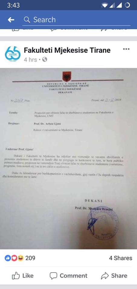 Tarfimim për çdo shërbim në fakultet, qoftë edhe për fotokopje? Kjo duket se është një panoramë aspak normale që vjen nga fakulteti i Mjekësisë, ku dekani i këtij fakulteti Xheladin Draçin, një eksponent i PD, ka tarifuar në kurriz të studentëve cdo element të jetës së fakultetit duke filluar që nga certifikata notash, fotokopje. Të gjitha këto detaje janë zbuluar nga një shkresë që dekani i këtij fakulteti i ka dërguar rektorit Arben Gjata, të cilit i bën të ditur që të hiqen tarifat për një sërë shërbimesh, të cilat duket e kanë bërë fakultetin si një kioskë shërbimesh për fotokopje.