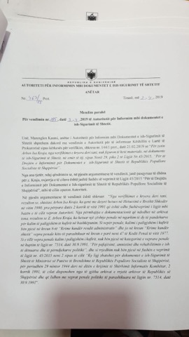 “Nga verifikimet e kryera deri tani, rezulton se, shtetasi Arben Isa Kraja, ka qenë me detyrë në Hetuesinë e Rrethit Shkodër në vitin 1990, pra përpara datës 2 korrik të vitit 1991, që është edhe fushëveprimi i ligjit mbi bazën e të cilit vepron autoriteti.