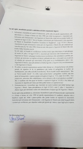 “Për zotin Arben Isa Kraja, nga verifikimet e kryerea deri më tani, nuk figuron të ketë materiale, në dokumente të ish-Sigurimit të Shtetit, në emër të tij, sipas nenit 29, pika 2 të Ligjit Nr.45/2015, “Për të Drejtën e Informimit për Dokumentet e ish-Sigurimit të Shtetit të Republikës Popullore Socialiste të Shqipërisë”.
