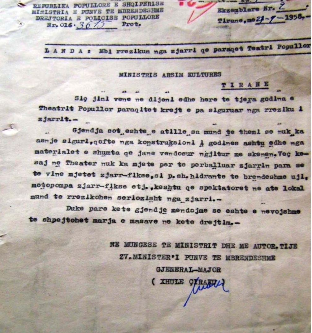 Kushtet e rrezikshme në të cilin punojnë artistët dhe aktorët në Teatrin Kombëtar është fakt që daton prej vitit 1958. Nevoja për një teatër të ri, del qartë edhe nga ky letërkëmbim midis Ministrisë së Brendshme dhe Ministrisë së Kulturës 70 vite më parë, ku theksohet qartësisht se gjendja e godinës ku është edhe sot teatri nuk ka asnjë siguri, qoftë nga konstruksioni, ashtu edhe nga materialet e shumta që janë vendosur ngjitur me skenën.