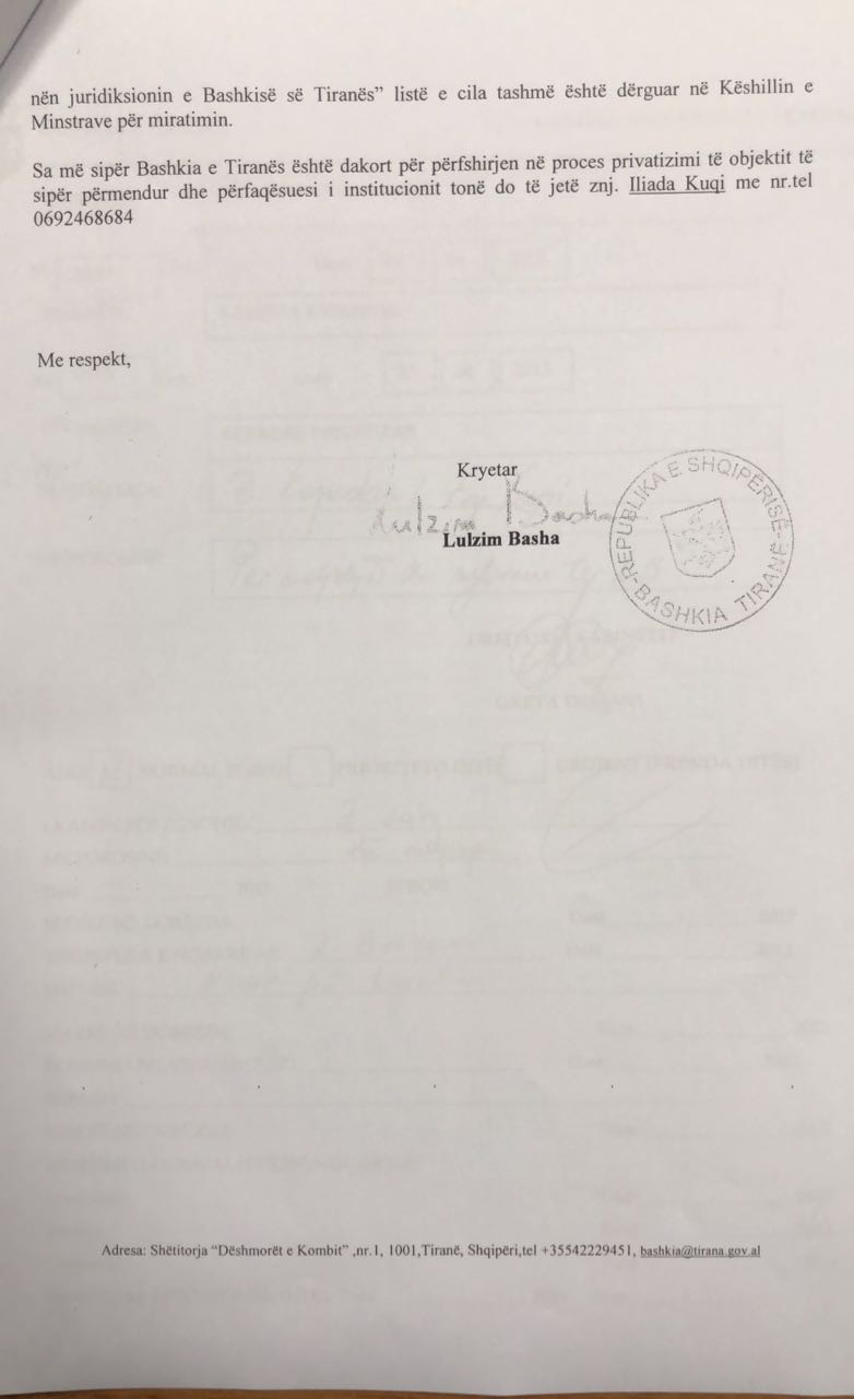 “Objekti që ju na kërkoni pronën duhet theksuar se është pjesë e listës së inventarit të pronave të Bashkisë Tiranë e miratuar me VKB-në nrI3, datë 28.02.2013 për “Miratimin e listës së pjesshme (pjesa e pestë) të inventarit të pronave të paluajtshme të cilat janë në territorin nën juridiksionin e Bashkisë së Tiranës” listë e cila tashmë është dërguar në Këshillin e Ministrave për miratimin. Sa më sipër Bashkia e Tiranës është dakord për përfshirjen në proces privatizimi të objektit të sipër përmendur dhe përfaqësuesi i institucionit tonë do të jetë znj. Iliada Kuqi me nr.tel 069…..84”, shkruhet në përgjigjen që Basha i drejton Florion Mimës.
