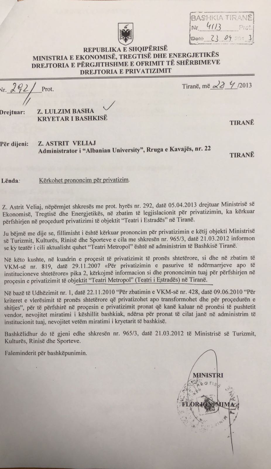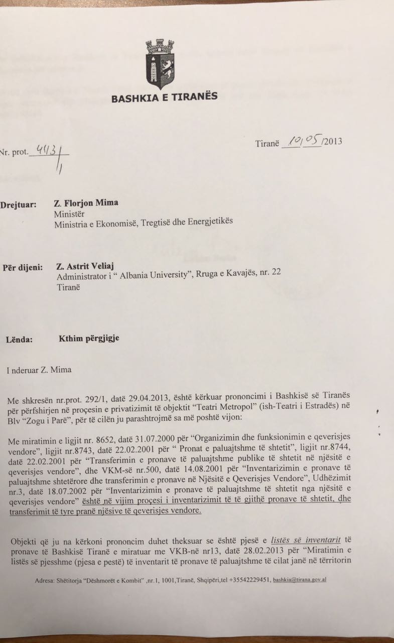 “Në kuadrin e procesit të privatizimit të pronës shtetërore, si dhe në zbatim të VKM-së nr. 819, datë 29.11.2007 “Për privatizimin e pasurive të ndërmarrjeve apo të institucioneve shtetërore” pika 2, kërkojmë informacion si dhe prononcimin tuaj për përfshirjen në procesin e privatizimit të objektit “Teatri Metropol” (Teatri i Estradës) në Tiranë. Në bazë të Udhëzimit nr. 1, datë 22.11.2010 “Për zbatimin e VKM-së nr. 428, datë 09.06.2010 “Nr kriteret e vlerësimit të pronës shtetërore që privatizohet apo transformohet dhe për procedurën e shitjes”, për të përfshirë në procesin e privatizimit pronat që kanë kaluar në pronësi të pushtetit vendor, nevojitet miratimi i këshillit bashkiak, ndërsa për pronat të cilat janë në administrim të institucionit tuaj, nevojitet vetëm miratimi i kryetarit të bashkisë”, thuhet në letrën që Mima i ka dërguar Bashës.