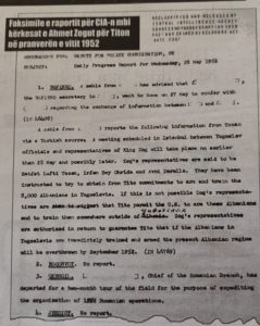 Dokumenti është një raport ditor i hartuar për drejtuesit e lartë të OPC, Drejtoria e famshme e CIA-s që merrej me Operacionet Klandestine dhe tregon disa detaje mjaft interesante. Fatkeqësisht, ashtu si edhe në dokumente të tjera të dala nga ky arkiv, emrat e personazheve amerikanë të OPC janë të fshirë dhe në këtë mënyrë e kemi paksa të pamundur për të kuptuar dinamikën e zhvillimeve brenda Drejtorisë së OPC, e cila drejtonte Operacionet Klandestine kundër Shqipërisë. Megjithatë, nga dokumenti i botuar sot, shikojmë se amerikanët kanë pasur mjaft interes për të vëzhguar negociatat e ish-Mbretit shqiptar me liderin komunist të Jugosllavisë, Tito. Nga burime agjenturore të rrjetit amerikan në Turqi, ata informohen mbi përbërjen e delegacionit të Zogut, i cili përbëhet nga një turk me emrin Tozani, Irfan Bej Ohri, një pasues i njohur i Zogut si dhe ish-Konsulli i Mbretërisë, Avni Dërhalla, i cili gjatë Luftës së Dytë Botërore ka qenë i rekrutuar nga Shërbimi Sekret Britanik me mision informimin e britanikëve mbi mërgatën shqiptare të Turqisë. Nëse Avni Dërhalla ka pasur akoma në këtë periudhë lidhje me Shërbimin Britanik apo jo, nuk ka ndonjë të dhënë të saktë për të gjykuar nëse britanikët ishin në dijeni të këtyre negociatave.
