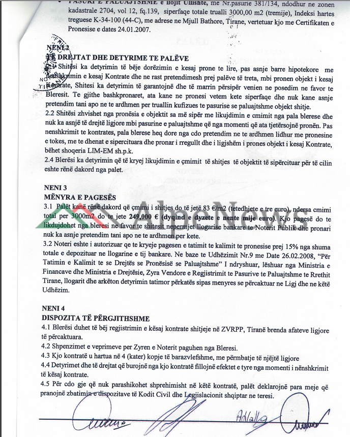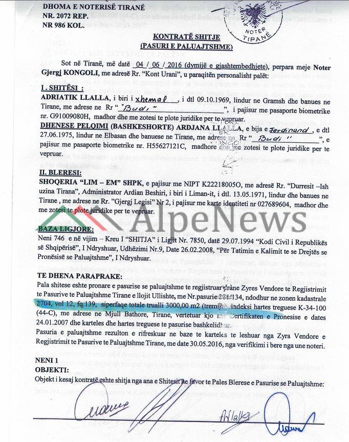 Sot Alpenews.al botoi të plotë Kontratën e shitjes dhe Çertifikatën e vërtetimit të pronësisë së Adriatik Llallës mbi një ullishte me sipërfaqe 3 000 metra katrorë në periferinë e Tiranës në një zonë shumë të lakmuar.