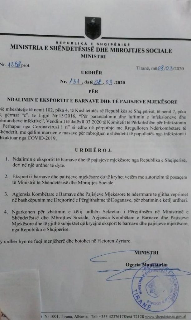 5- Ndalohet eksporti i barnave dhe pajisjeve mjekësore nga Shqipëria. Një gjë e tillë lejohet vetëm me autorizim të posaçëm nga MSH. /e.s/