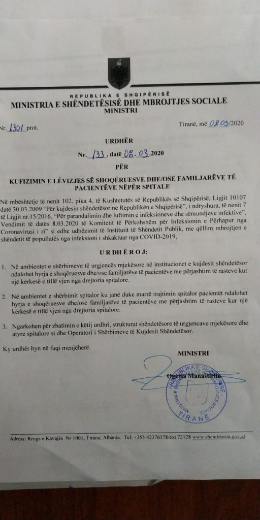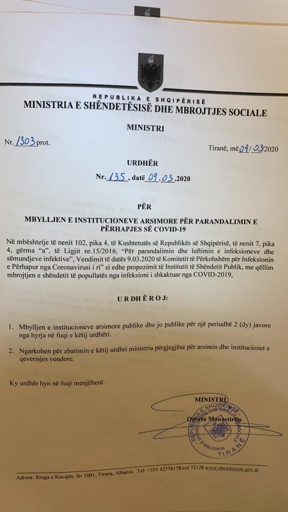 Ministria e Shëndetësisë ka shpërndarë të gjitha urdhrat e marra nga qeveria me qëllim parandalimin e përhapjes së COVID -19 në Shqipëri. Urdhrat kanë hyrë tashmë në fuqi.