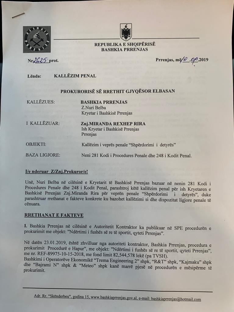 Kryebashkuaku aktual e ka akuzuar Riren per “shperdorim detyre” dhe ne dokumentin dorezuar ne organin e akuzes ka argumentuar edhe rastin konkret per te cilin e ka bere padine.
