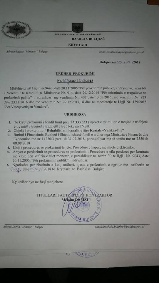 Në mbledhjen e parë mbas aktit normativ të Këshillit të Bashkisë Bulqizë më 6 shtator 2018 është konfirmuar destinacioni i fondit dhe në datën 26 shtator është ngarkuar në sistem urdhëri i prokurimit me të njëjtin objekt.