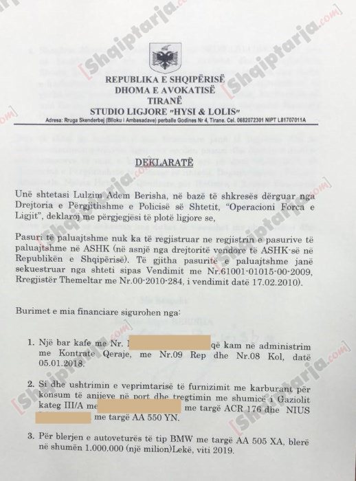 Në formular, Berisha deklaron se nuk ka asnjë pasuri të paluajtshme të regjistruar në emrin e tij, për shkak se ato i janë konfiskuar nga shteti me vendim gjykate në 2010, por deklaron se zotëron një bar kafe me qira, autobote që furnizon me karburantë anijet e portit, një makinë dhe aksione në kompaninë që ka në bashkëpronësi me motën e tij.
