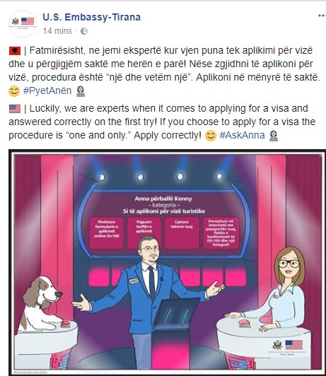“🇦🇱 | Fatmirësisht, ne jemi ekspertë kur vjen puna tek aplikimi për vizë dhe u përgjigjëm saktë me herën e parë! Nëse zgjidhni të aplikoni për vizë, procedura është “një dhe vetëm një”. Aplikoni në mënyrë të saktë. 😊#PyetAnën 👩🏻💻”, shkruhet në mesazhin e Ambasadës Amerikane.