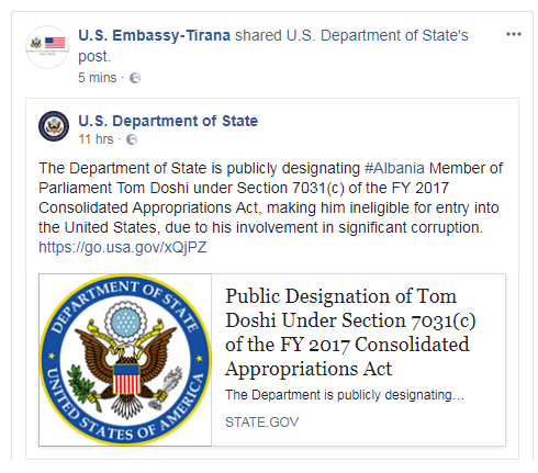 “Departamenti i Shtetit po njofton publikisht se ka ndaluar deputetin e Kuvendit të Shqipërisë, Tom Doshi, sipas nenit 7031 (c) të Aktit të Ndarjeve të Përbashkët të FY 2017, të hyjë në Shtetet e Bashkuara, për shkak të përfshirjes së tij në korrupsion. Pas ish kryeprokuorit Adriatik Llalla, Tom Doshi bëhet zyrtari i dytë nga Shqipëria të cilit i ndalohet hyrja në Shtetet e Bashkuara për shkak të përfshirjes në raste madhore korrupsioni”, thuhet në njoftim.