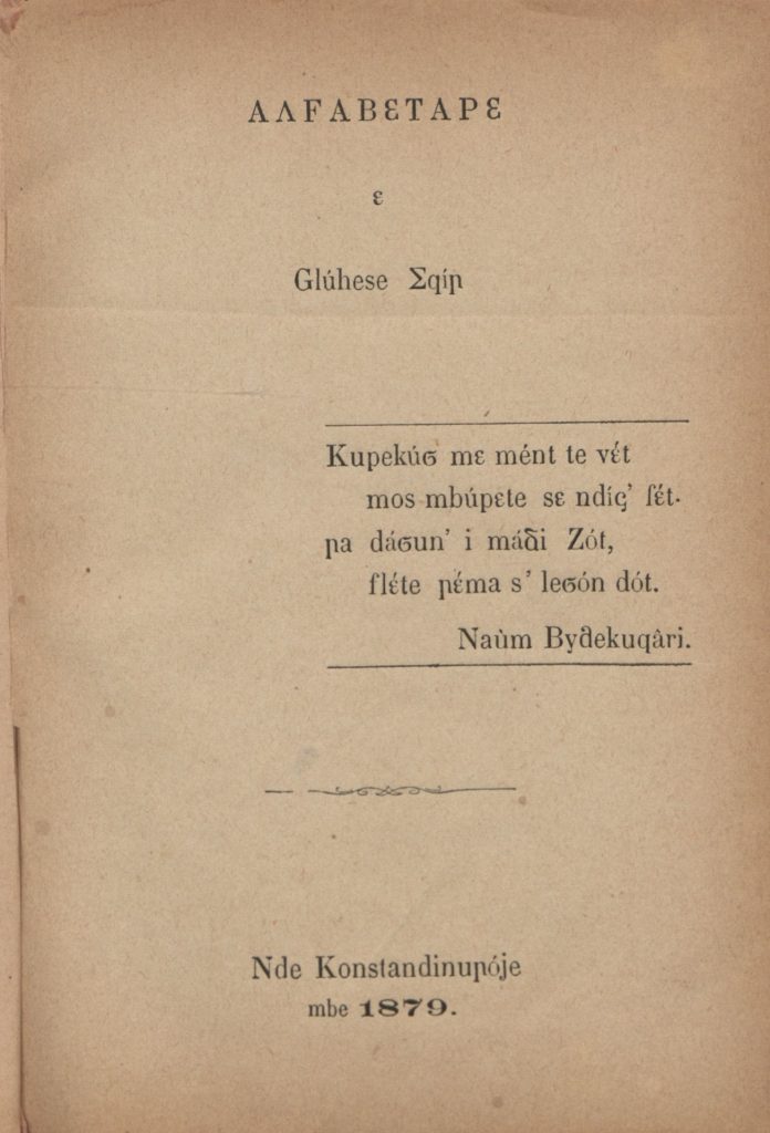 Libri “AΛFABETARE E GLÚHESE ΣQIP” është përgatitur nga Shemsudin Sami Frashëri, Jani Vreto, Pashko Vasa etj., dhe është botuar në Stamboll më 1879. Një kopje e librit, me kapakë kadife të kuqe të shkruar me shkronja ari, i është dhuruar Sulltan Abdyl Hamitit II, i cili ka ditur të flasë shqip.