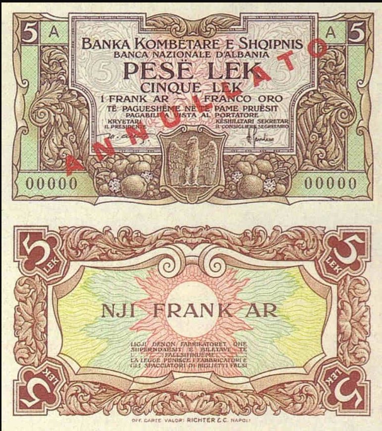Studiuesi Haxhi Shkoza shkruan se kartëmonedhat 1 frangëshe (5 lekë) të printuara nga “Richter &Co” u hoqën nga qarkullimi shpejt pasi qeveria shqiptare nuk i pranoi ato. Shkak u bë fakti se kartëmonedhat 1 frang (5 lekë) kishin si element identifikues shqiponjën romake me 1 kokë dhe jo atë shqiptare dykrenare.