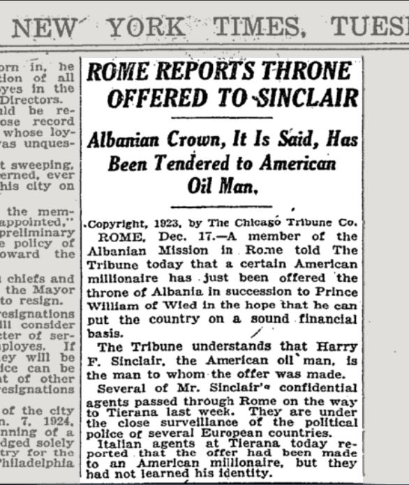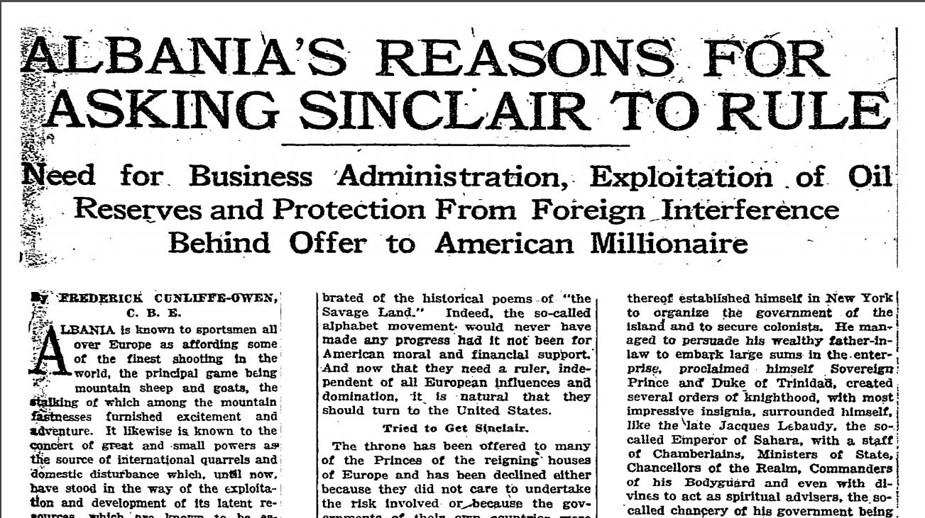 “Raportime të ndryshme shkruajnë se froni i Shqipërisë i është ofruar Harry F.Sinclair, amerikanit të naftës, si pasues i Princit Wilhelm Wied me shpresë së ai mund të fusë vendin në baza ekonomike të shëndosha” shkruhet në artikull, por më tej evidentohet se kur është marrë mendimi i ortakëve të biznesit të Sinclair, këta të fundit u morën me të qeshur duke thënë vetëm se kompanitë e shumta që zotëronte industrialisti i njohur e mbanin atë më të ngarkuar me punë sesa do të mundeshin ndonjëherë financat e Shqipërisë.