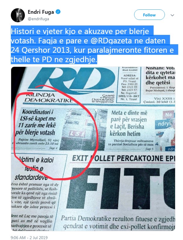 Postimin Fuga e shoqëron me statusin “Histori e vjetër kjo e akuzave për blerje votash. Faqja e parë e RDgazeta në datën 24 Qershor 2013, kur paralajmëronte fitoren e thellë të PD në zgjedhje” shkruan ai.