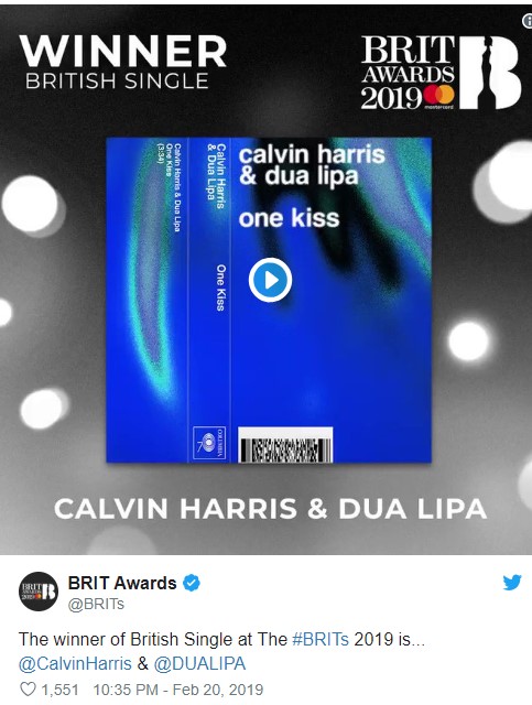 Pas marrjes së çmimit Dua ka dalë në skenë me Calvin të cilin e ka falënderuar për këtë këngë. Më parë Calvin është shpërblyer edhe për çmimin si producenti më i mirë britanik.