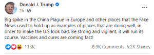 Përmes një postimi në Facebook, Trump shprehet se “lajmet e rreme” janë munduar ta paraqesin situatën në Europë si nën kontroll dhe të menaxhuar mirë, për ta bërë SHBA-në të duket keq.