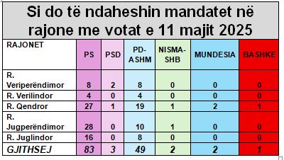 Ndërkohë, përfaqësimi në Kuvendin e Shqipërisë duhet të bazohet në rajonet, sepse qarqet aktuale nuk kanë pse të ekzistojnë më në një ndarje rajonale. Nga pikpamja elektorale, kalimi nga 12 qarqe në 5 rajone nuk do sillte ndonjë ndryshim (shihni në tabelën e mëposhtme sesi do të ishin shpërndarë mandatet më 11 maj 2025 me një ndarje rajonale).