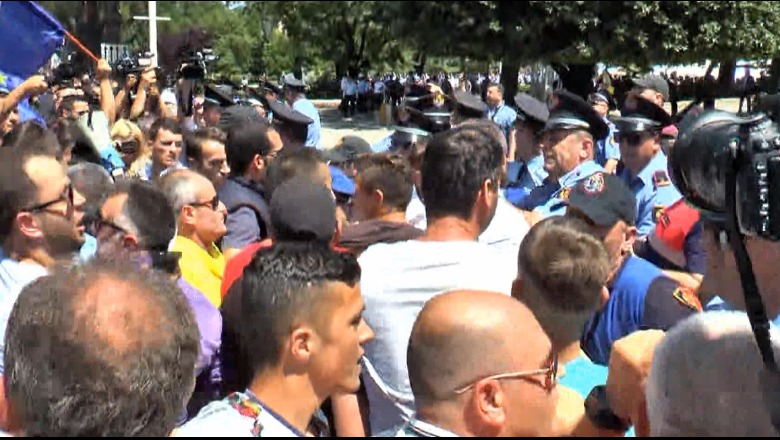 12:33/ Një grup protestuesish sulmojnë policinë me një kordon metalik. Ata shtynë punonjësit e rendit ndërkohë njëri prej tyre u ndje keq.