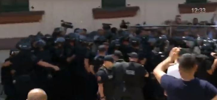 Uniformat blu formuan disa kordonë për të mos lejuar depërtimin drejt godinës. Policia u bëri disa herë thirrje protestuesve të mos sulmojnë uniformat blu.