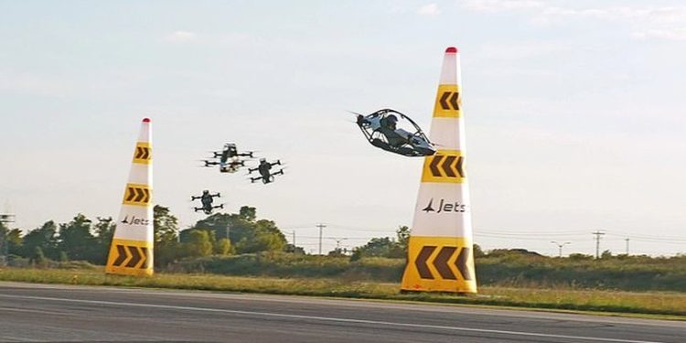 Në këtë ngjarje historike, katër pilotë konkurruan kokë më kokë në një pistë ajrore me kthesa të rrezikshme, duke drejtuar Jetson One, një mjet fluturues elektrik me shpejtësi maksimale prej 102 km/h dhe autonomi deri në 32 kilometra. Ngjarja u zhvillua në UP.Summit, në Teksas, ku përveç garës u realizua edhe fluturimi i parë formacion me katër makina fluturuese.