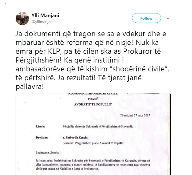 “Ja dokumenti që tregon se sa e vdekur dhe e mbaruar është reforma që në nisje! Nuk ka emra për KLP, pa të cilën s’ka as Prokuror të Përgjithshëm! Ka qenë insistimi i ambasadorëve që të kishim “shoqërinë civile”, të përfshirë. Ja rezultati! Të tjerat janë pallavra!”, shkruan Manjani.