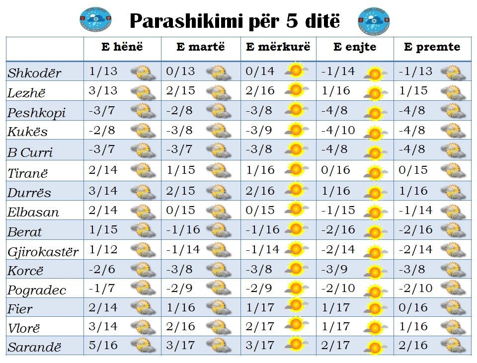 Pas situatës me reshje të kësaj fundjave parashikohet rikthimi i ditëve me diell e hera herës vranësira deri mesatare. Prezente gjatë mëngjeseve do të jetë mjergulla e mjegullina në lugina.Era, përgjithësisht parashikohet nga lindja e veriperëndimi e lehtë e mesatare.