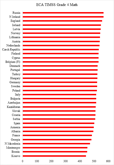Në matematikën e klasës 4, Shqipëria renditet e 7 nga fundi. Më të mirët, edhe një herë, erdhën nga Azia Lindore: Singapori, Hong Kong SAR, Korea, Kineze Taipei (599) dhe Japonia (593). Ata u ndoqën nga vendet europiane, të udhëhequr nga Federata Ruse, por në 567 pikë, kjo është më shumë se 50 pikë, ose një gjysmë devijimi standard, prapa liderit global dhe përfaqëson më shumë se një vit mësimi. Shqipëria në këtë renditje lë pas Francën dhe vendet e rajonit. Kosova renditet e fundit.