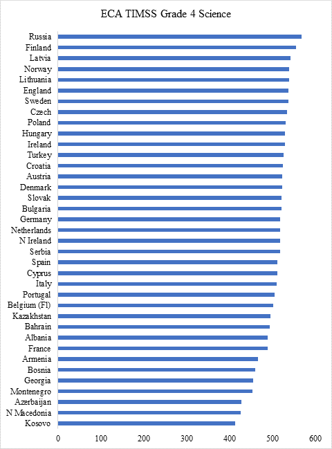 Në Shkencën e klasës 4, Shqipëria renditet e 9 nga fundi mes 64 shteteve. Kosova renditet edhe për këtë kategori e fundit. Më të mirët kryesorë janë kryesisht nga Azia Lindore (Singapori, Korea, Japonia, Taipei Kinez) por gjithashtu përfshijnë Rusinë, Finlandën, Letoninë, Norvegjinë, Shtetet e Bashkuara dhe Lituaninë. Rajoni i Evropës dhe Azisë Qendrore (ECA) ka parë disa rritje të mëdha, përfshirë Qipron me një fitim prej 61 pikësh që nga 1995; gjithashtu, Armenia, Gjeorgjia, Portugalia dhe Rusia. Përmirësimi i dukshëm i Armenisë vjen në një kohë kur Banka Botërore vuri në dukje nivele të larta të të mësuarit të varfërisë. Përpjekjet për reformë më në fund po japin shpagim. Gjatë dekadës, Armenia është përqendruar në vlerësim, mbështetur pjesërisht nga përpjekjet për të rritur kapacitetin e vendit në vlerësimin e studentëve.
