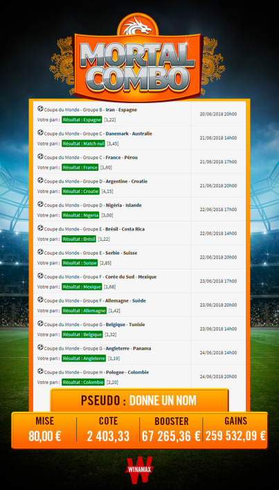 Ai e vendosi skedinën në një kompani franceze bastesh online, duke gjetur përfundimin e 12 ndeshjeve. Por ka qenë me shumë fat, sepse fitorja e Zvicrës erdhi në fund me golin e Shaqirit, ajo e Gjermanisë ndaj Suedisë në shtesë me golin e Krosit dhe e Brazilit ndaj Kosta Rikës po në shtesë me golat e Kutinjos dhe Nejmarit.