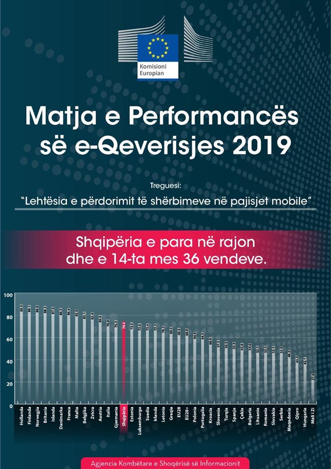 Shqipëria është vlerësuar nga Komisioni Europian si e para në rajon për Qeverisjen Elektronike në 2019. Lajmin e ka bërë publik kryeministri Rama i cili ka shpërndarë edhe një foto të grafikut të 36-vendeve që aplikojnë E Qeverisjen.