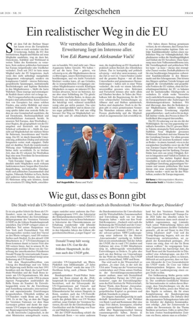 Në një editorial të përbashkët të publikuar në Frankfurter Allgemeine Zeitung (FAZ), Kryeministri i Shqipërisë Edi Rama dhe Presidenti i Serbisë Aleksandar Vučić propozojnë një qasje të re strategjike për avancimin e procesit të zgjerimit të Bashkimit Europian.