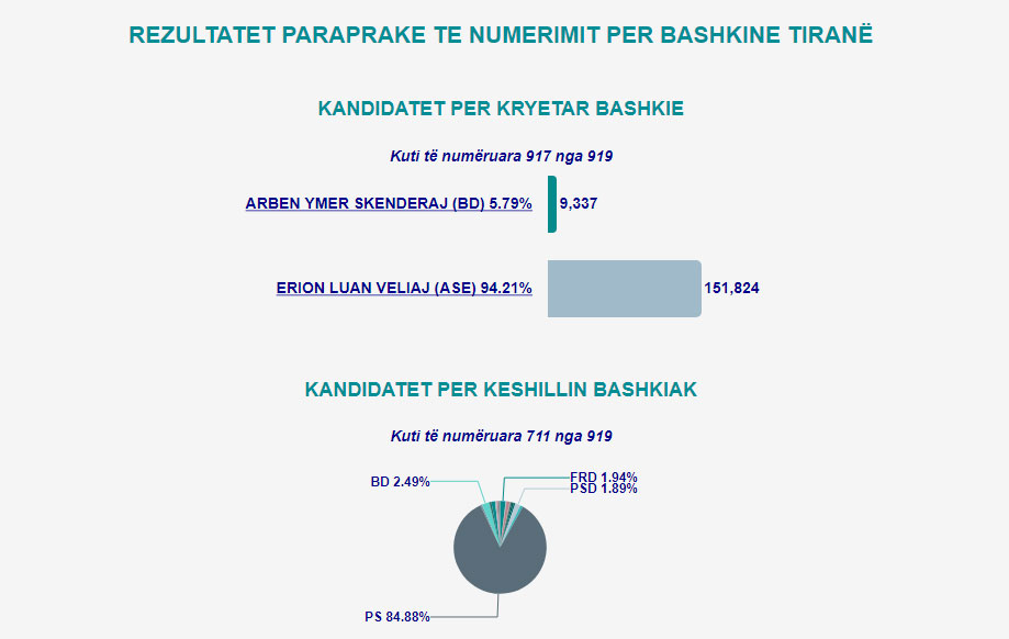 Edhe Tirana po vete drejtë fundit pasi nga numërimi i 917 kutive nga 919 që janë në total në Tiranë, rezulton se, Erion Veliaj ka marre: 151. 824 vota.