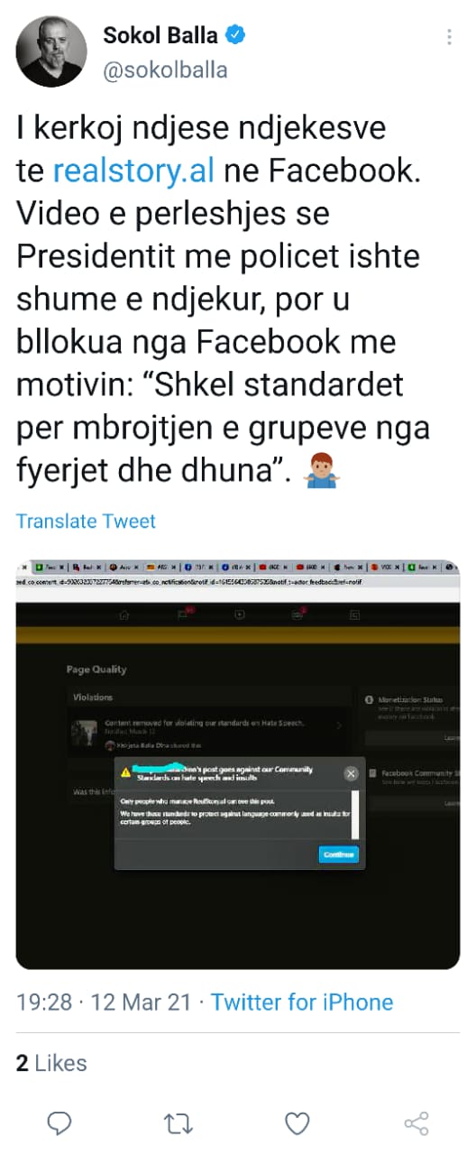 “I kerkoj ndjese ndjekesve te http://realstory.al ne Facebook. Video e perleshjes se Presidentit me policet ishte shume e ndjekur, por u bllokua nga Facebook me motivin: “Shkel standardet per mbrojtjen e grupeve nga fyerjet dhe dhuna”, shkruan Balla.