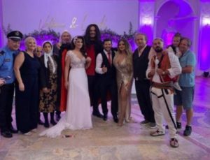 Në rrjet po qarkullojnë disa foto ku Rama shihet mes kastit të aktorëve, i veshur me të zeza, një bluzë të kuqe dhe paruke në kokë.