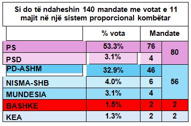 Në versionin e PD-së (me 140 deputetë), dy partitë mazhoritare (PS dhe PSD) do të siguronin 80 mandate, kurse PD-ja dhe partitë e afërta me të (Meta, Lapaj, Shehaj, etj.) do të siguronin gjithsej 56 mandate. Ndërkohë partia e Qorit dhe e Bashës do të siguronin nga 2 mandate secila (shihni tabelën e mëposhtme).