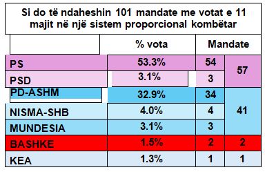 Në versionin e PS-së (me 101 deputetë), dy partitë mazhoritare (PS dhe PSD) do të siguronin 57 mandate, kurse PD-ja dhe partitë e afërta me të (Meta, Lapaj, Shehaj, etj.) do të siguronin gjithsej 41 mandate. Ndërkohë partia e Qorit dhe e Bashës do të siguronin nga 2 dhe 1 mandate përkatësisht (shihni tabelën e mëposhtme).