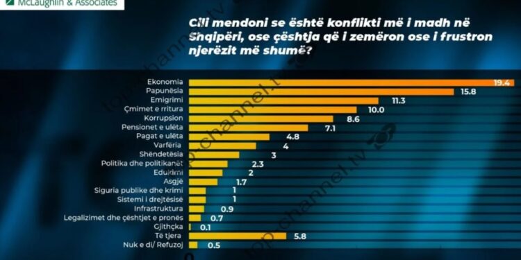Ekonomia është çështja që i zemëron dhe frustron më shumë shqiptarët, sipas sondazhit të “McLaughlin and Associates”, zhvilluar në periudhën 26 prill – 3 maj.