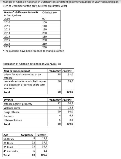 Nga ana tjetër, posaçërisht në Hollandë, sipas statistikave zyrtare, në vitin 2017 ka pasur 58 shqiptarë me problem me ligjin, nga të cilët vetëm 18 janë dënuar me vendim gjykate dhe 40 të tjerë kanë qenë në paraburgim. Të arrestuar apo të dënuar në episode në lidhje me drogën, kanë qenë vetëm 29 qytetarë shqiptarë.