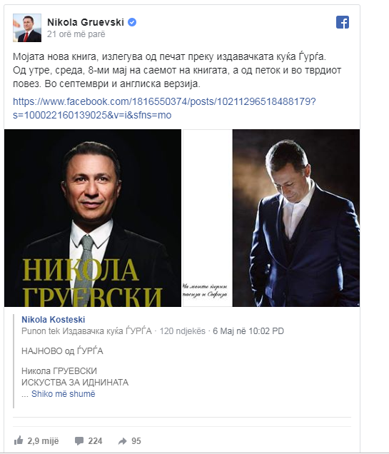 “Libri im i ri, del nga shtypi përmes shtëpisë botuese Gjurgja. Prej nesër, e mërkurë, 8 maj në panairin e librit, ndërsa nga e premtja në treg. Në shtator edhe version anglez”, ka shkruar ish kryeministri Gruevski në “Facebook”.