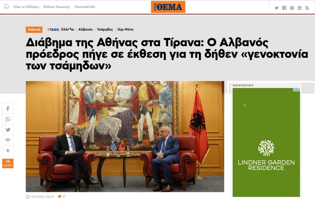 E përditshmja greke Protothema shkruan se autoritetet në Greqi i e quajnë provokim mbështetjen që i ka dhënë Presidenti i Shqipërisë, Ilir Meta, ekspozitës të iniciuar nga Akademia “Rrënjët shqiptare” dhe fondacioni “Çamëria Hasan Tahsini”.