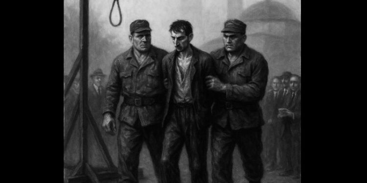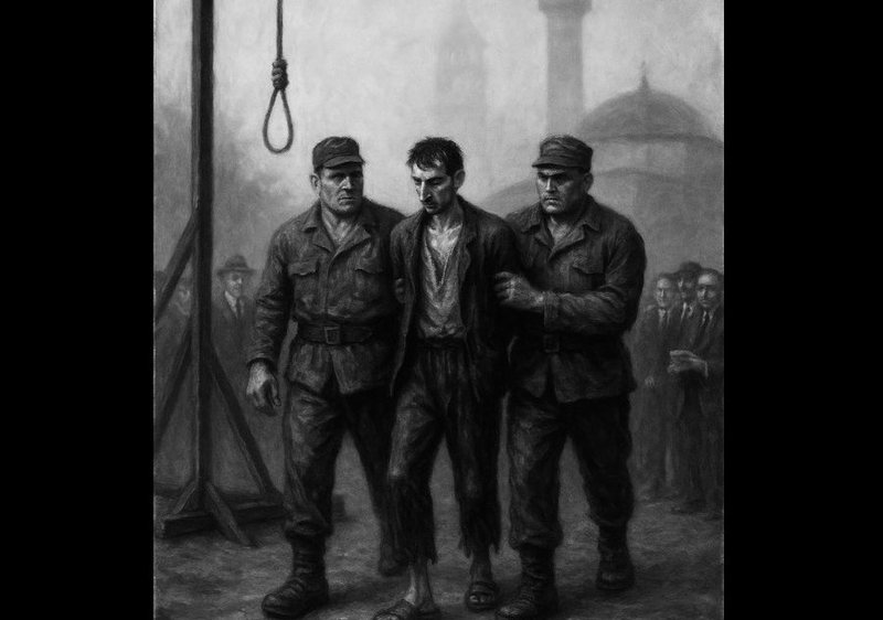 E hipën mbi karrige, por ai ishte i shkurtër dhe nuk i arrinte qafa tek litari. Xhandarët e ngritën dhe u përpoqën t’ia vinin lakun në qafë.