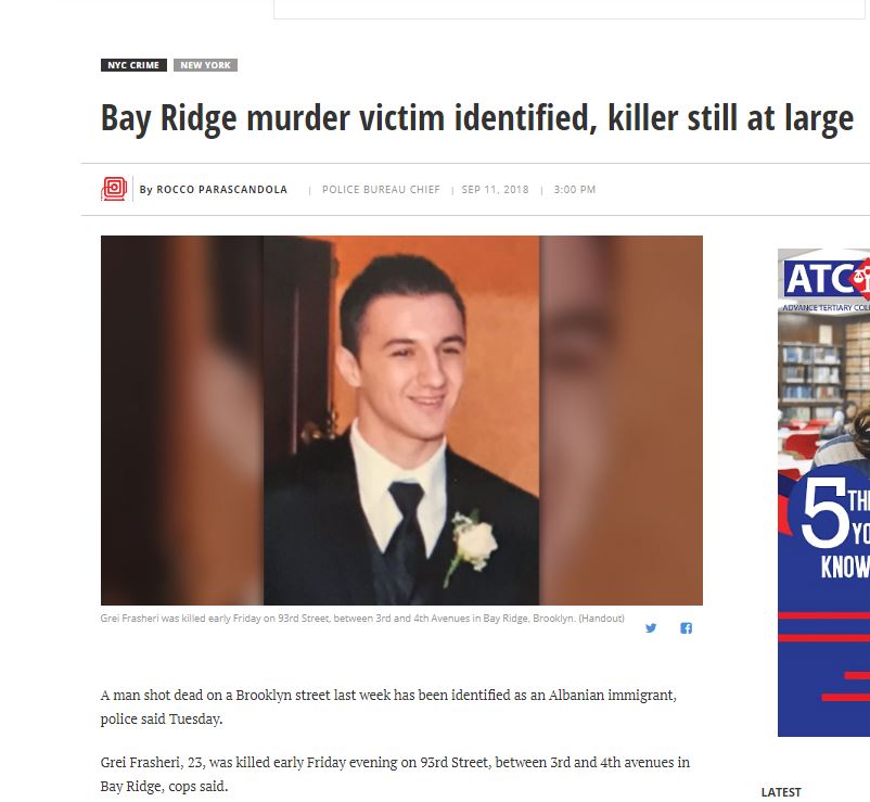 Mësohet se viktima është Grei Frashëri 23 vjeç, i cili u qëllua për vdekje me armë nga persona ende të paidentifikuar në Bay Ridge në Brooklyn, shkruan nydailynews.com.