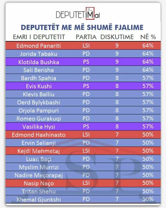 Tabelat më poshtë paraqesin deputetët më aktiv dhe më pasiv në parlament, – ata që kanë mbajtur fjalime të rregullta ose diskutime thelbësore në parlament si dhe ata që të vetmen fjalë në 3 muaj parlament kanë pasur fjalën “betohem” në seancën e parë inauguruese.